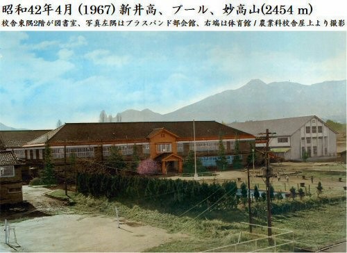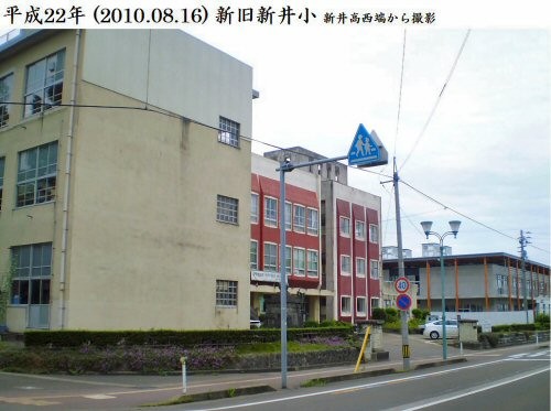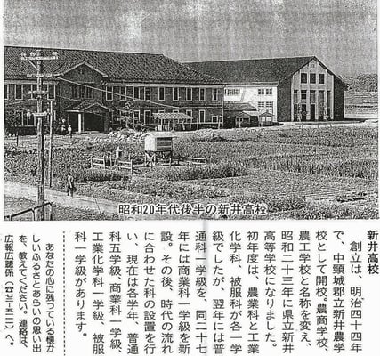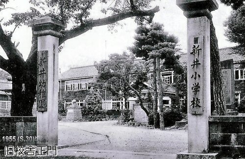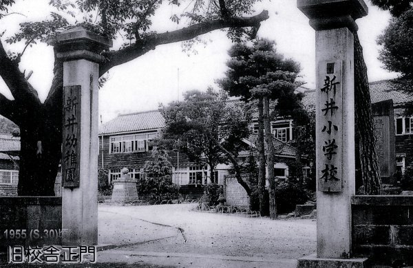 昭和戦前の写真です。門柱には「新井尋常高等小学校」と、「新井尋常高等女学校」の看板がかかっています。戦後生まれのヨッシーは、門柱脇の桜の木をよく覚えています。勤研センター方向に10数本咲き誇っていました。