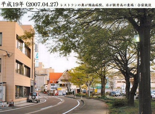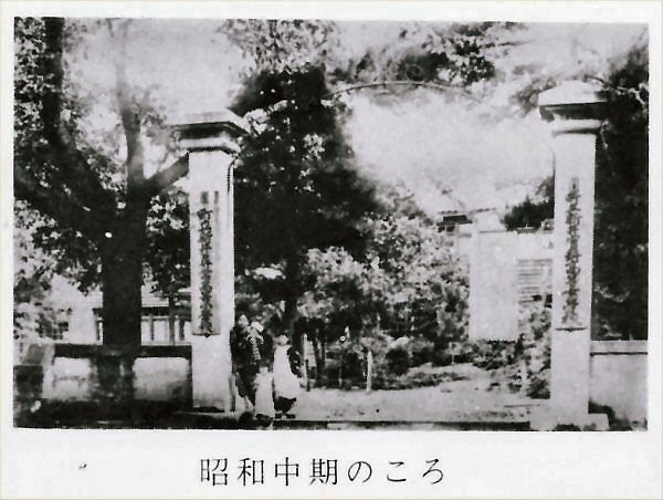 This is a photo taken before the war in Showa period (1926 – 1989 *CE). We see two signboards hung on the gateposts; one *reads “Arai Jinjo Higher Elementary School” and another does “Arai Jinjo Higher Women’s School”. Yoshy who was born after the war clearly remember the cherry tree beside the left gatepost. There were about *ten-odd ones toward Kin-ken Center which were in full bloom every spring.