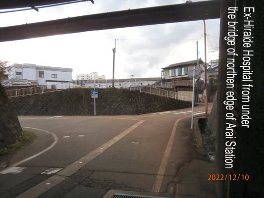 <0h: 新井駅橋梁(きょうりょう)より西方向、元平出外科医院跡地:Toward the site of ex-Hiraide Surgical Hospital from the Bridge of Arai St located at the edge to the north.>