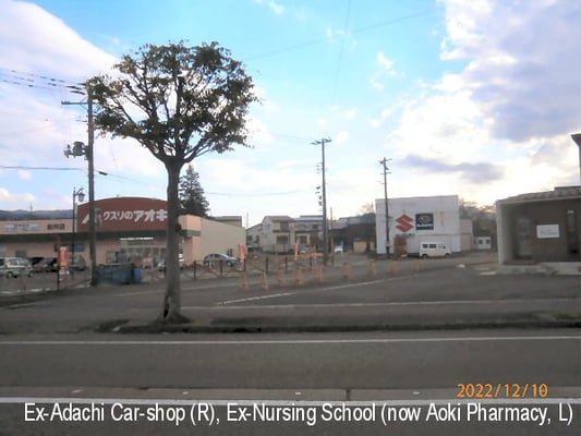 <0m: 諏訪町通り南側、元安達自動車跡地、第一保育園跡地にアオキ薬局が: The southern side of Suwa-cho St. The site of ex-Adachi Car shop and the one of The First Nursery School, now Aoki Pharmacy.>