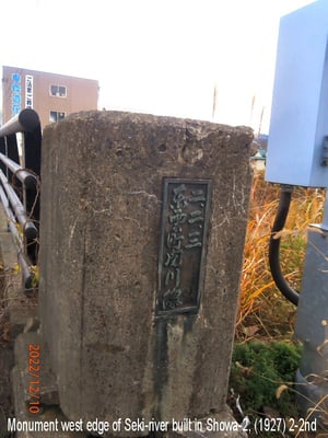 <0L: 関川橋西端の石碑、「ニ、二、二 東雲町関川線」Stone Monument at the western edge of Seki-river, written “Build on Feb 2nd, Showa 2 (1927), Shinonome-cho Sekikawa Line”>