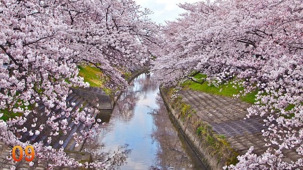 9. Cherry blossoms along a stream in Japan