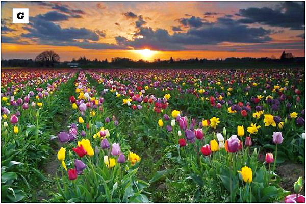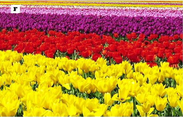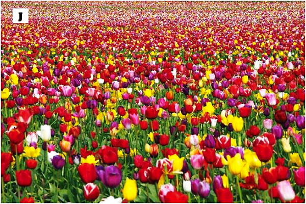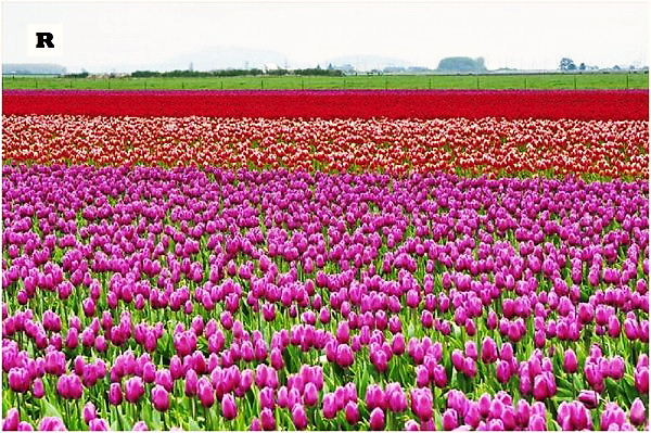 R: 紫、赤、緑、ピンク。色彩の祝賀会のようです。全てのチューリップが良い香りとは限りませんが、どれも食用になります。事実、第二次大戦中の1944年のオランダの飢饉では、人々は、チューリップとサトウキビで飢えを凌いだのです。