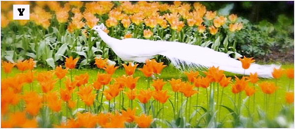 Y: Keukenhofの、オレンジ色のチューリップの中の白い孔雀。目を見張る写真です。