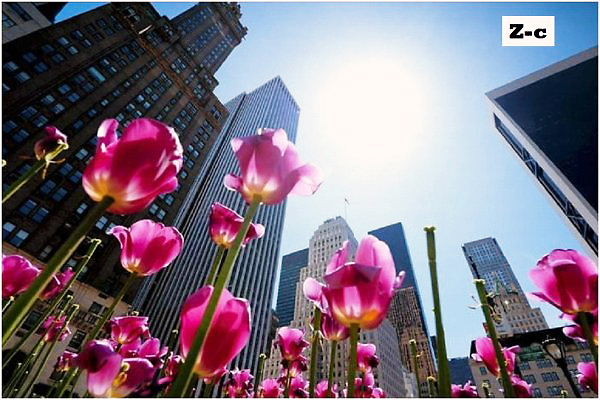 Z-c: ニューヨークに咲く、先端が白い紫のチューリップ。