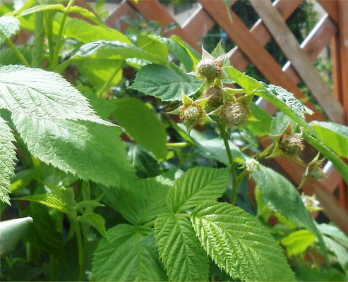 5月27日(火)撮影の、ラズベリーとブラックベリーです。茎に棘(とげ)があるのがラズベリー。ラズベリーの和名は、木苺(きいちご)で、BKG植物辞典によると、花言葉は、「嫉妬、希望」だそうです。