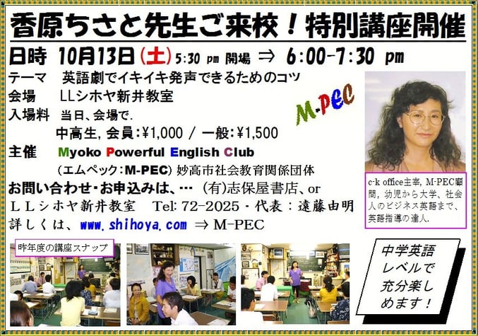 今年もM-PEC顧問:香原ちさと先生が「特別講座」の講師としてLLシホヤ新井教室へご来校!