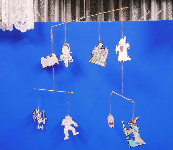 定番の「ハロウィーン・キャラクター・叩き」、「福笑い」、「お化けカボチャのお面づくり」、…そして、「家族で作れるようにじゅんびした・お化けのモビール」をお土産にしたクラスもありました。