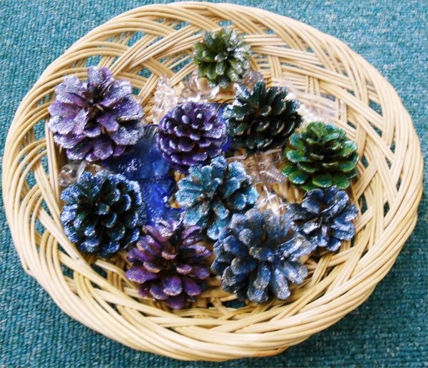 R is making Xmas ornaments by using these pinecones coloring them.