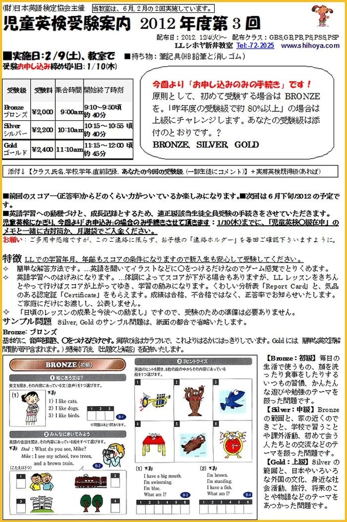 2012年度第3回「児童英検」は、2月9日(土)、午前中に、LLシホヤ新井教室で実施致します。