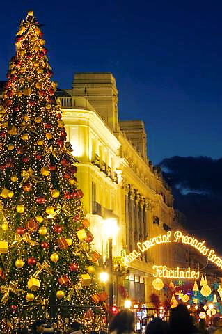 The Christmas tree that greets revelers at the Puerta del Sol is dressed for a party. Madrid 's two-week celebration makes millionaires along with merrymakers. On Dec. 22, a lucky citizen will win El Gordo (the fat one), the world's biggest lottery.