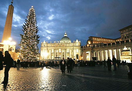 In addition to the Vatican 's heavenly evergreen, St. Peter's Square in Rome hosts a larger-than-life nativity scene in front of the obelisk.