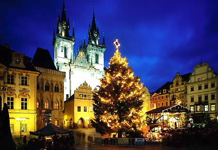 Illuminating the Gothic facades of Prague's Old Town Square, and casting its glow over the manger display of the famous Christmas market, is a grand tree cut in the Sumava mountains in the southern Czech Republic.