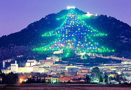The world's largest Christmas tree display rises up the slopes of Monte Ingino outside of Gubbio, in Italy 's Umbria region. Composed of about 500 lights connected by 40,000 feet of wire, the 'tree' is a modern marvel for an ancient city