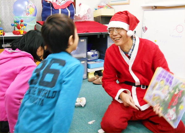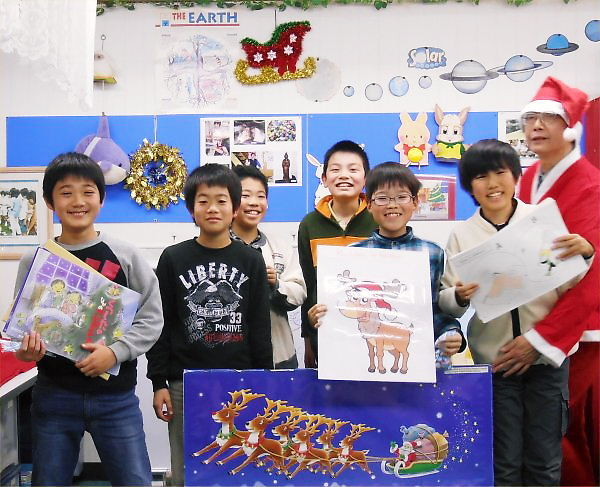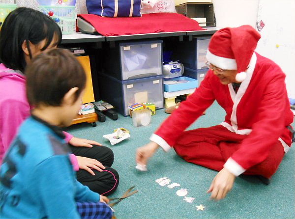 “Singing an English Song of Rudolph Red-nosed Reindeer”, “Making Face of Rudolph”, “English Picture-card Show: Xmas Present in a Sock”, “Addition, Subtraction, Multiplication and Division by Using Playing-cards”… There were so many games or activities in it.