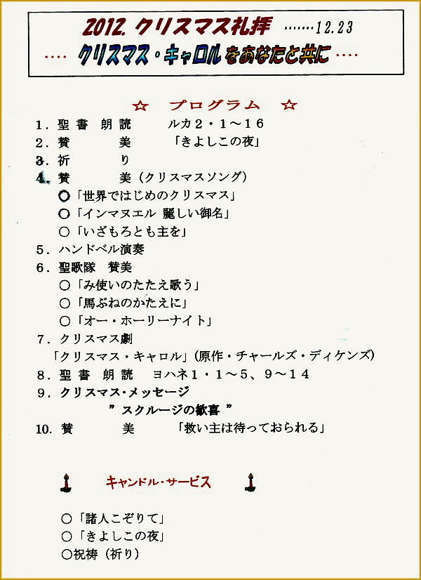 「プログラム」は、<1> 聖書朗読:ルカ2-1~16 <2> 賛美:「きよしこの夜」 <3> 祈り <4> 賛美:「クリスマスソング」 <5> ハンドベル演奏 (子ども達) <6> 聖歌隊 賛美 <7> クリスマス劇:「クリスマスキャロル」 (原作:チャールズ・ディケンズ) <8> 聖書朗読:ヨハネ1-1~5, 9~14 <9> クリスマス・メッセージ:「スクルージの歓喜」 <10> 賛美 …キャンドルサービス