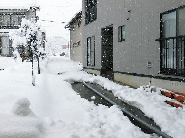 長い塩ビ管は、屋根の融雪用スプリンクラーからの井戸水です。