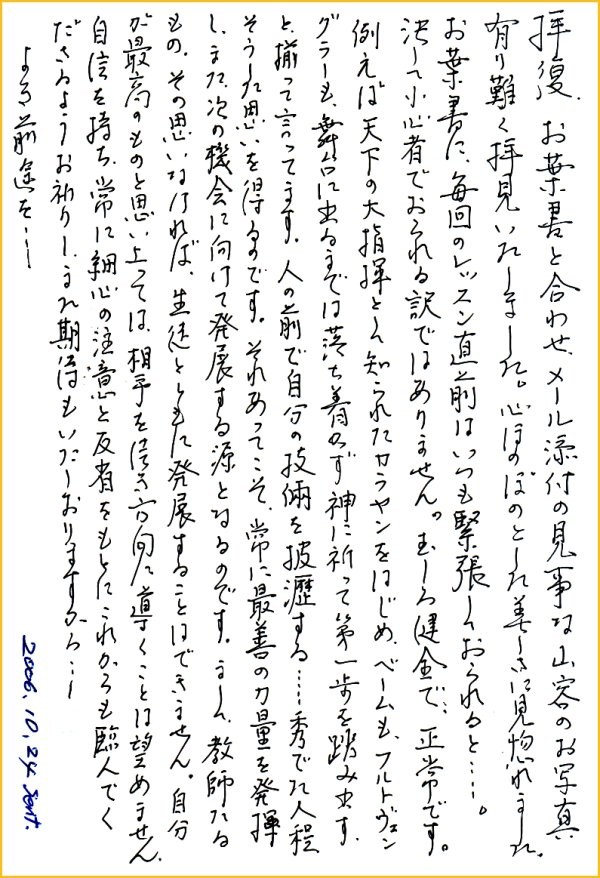 お葉書に毎回のレッスン直前はいつも緊張しておられると…。決して小心者でおられるわけではありません。むしろ健全で、正常です。例えば天下の大指揮者として知られたカラヤンをはじめ、ベームも、フルトヴェングラーも、舞台に出るまでは落ち着かず神に祈って第一歩をと、揃って言っています。人の前で自分の技倆を披瀝する…秀でた人ほど、そうした思いを得るのです。それあってこそ、常に最善の力量を発揮し、また、次の機会に向けて発展する源となるのです。まして、教師たるもの、その思いなければ、生徒とともに発展することはできません。自分が最高のものと思い上がっては、相手を佳き方向に導くことは望めません。自信を持ち、常に最新の注意と反省をもとにこれからも臨んでくださるようお祈りし、また期待もいたしおりますから…よき前進を…
