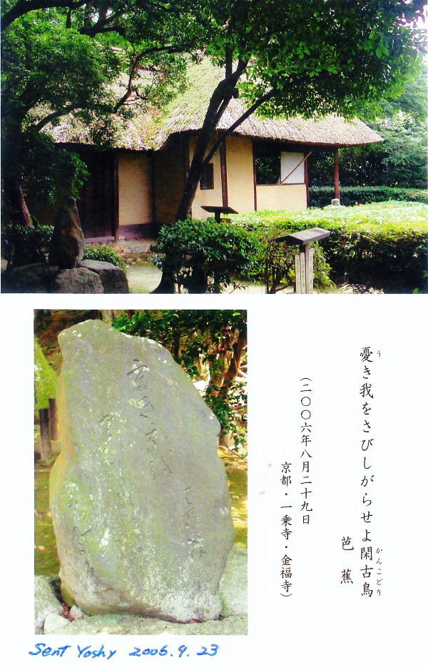 (中略)…先日、小生は京都を訪ねてまいりました。…「一乗寺下り松」に足を向けました。次いで「詩仙堂」へと、これは計画の内、ふとその足が止まったのは、右手に「芭蕉、蕪村ゆかりの金福寺」との案内。…そして行き当たったのが2葉の写真、一つは蕪村らが、芭蕉を偲んで再建した「芭蕉庵」です。その袂(たもと)に、かの有名な「憂き我をさびしがらせよ閑古鳥」の句碑がありました。