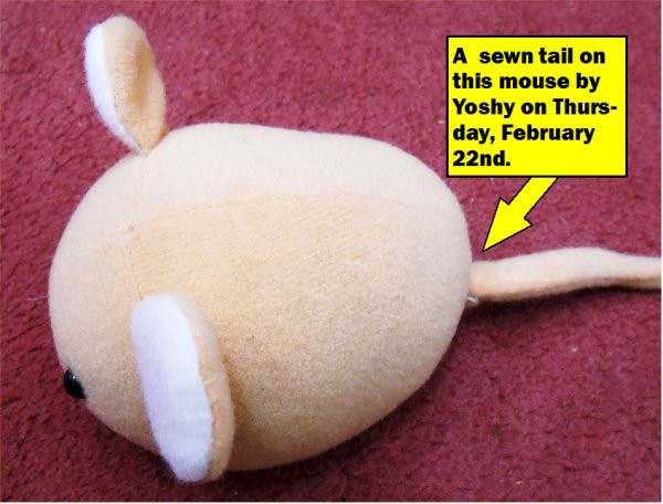 Yoshy sewed up its tail on the mouse with awkward hands.