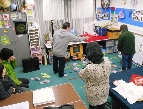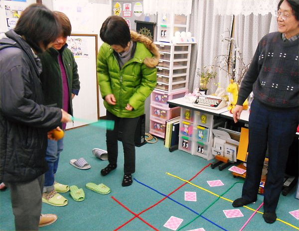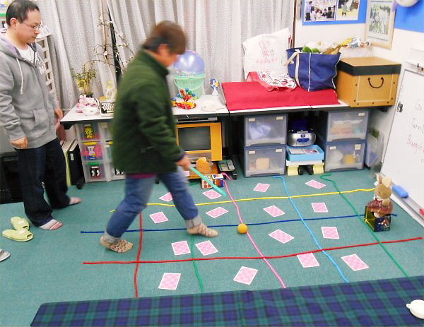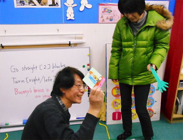 ペアになって、一人が英語の指示の通りに、もう一人が「ヘルプハンド」で卵を動かします。「~ブロック真っ直ぐ歩け。」、「右へ / 左へ曲がれ。」と、「ウサギの家は、あなたの右 / 左にあるよ。」の3つの指示だけで誘導します。