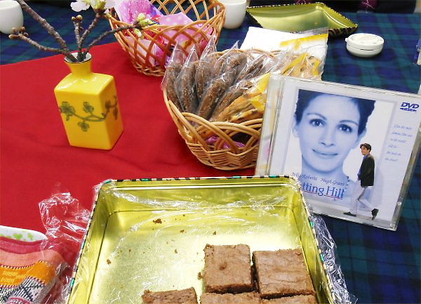 ティータイムでは、DVD:「ノッティングヒルズの恋人」の名場面、「一番みじめな人がブラウニーケーキをもらえる」を鑑賞しました。偶々、Yさんがブラウニーを作ってご持参下さいましたので…。