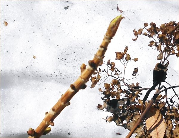 3月12日(火)、勤研センター玄関前に、雪の隙間から「紫陽花の新芽」がひょっこり顔を出しているのが見えました。