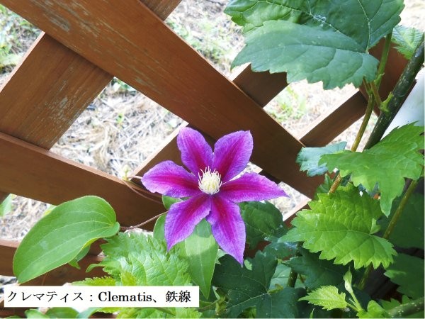 「クレマティス」:英語表記は、Clematis, Travelers’ Joy、和名は「鉄線」(テッセン)、花ことばは、「高潔」。