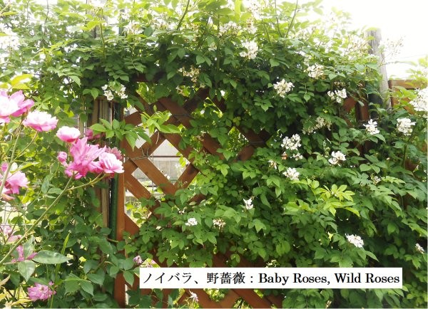 「ノイバラ」:別名「野薔薇 (のばら)」。英語表記は、Wild Roses, Baby Roses、花ことばは、「素朴なかわいらしさ」。