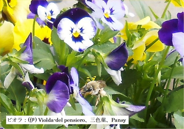 「ビオラと花粉だらけになった蜜蜂」:イタリア語表記は、Violda-del pensiero、英語名は Pansy, Viola、和名は「三色菫」 (さんしきすみれ)、花ことばは、「思想」。
