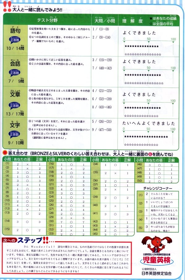 GOLD, the highest level of it includes several questions about “reading comprehension of words or phrases”, but the others have nothing of it. The examinee is checked about almost only listening skills in this Junior Eiken.
