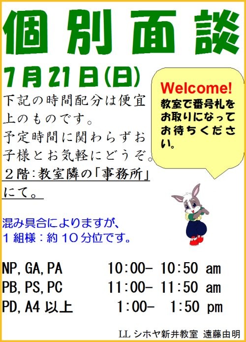 BTW, today, July 20th (Sun), PTS: parent-teacher-student meeting is on schedule held from 10:00 am to 2:00 pm at LL Office next to LL Shihoya Arai School.