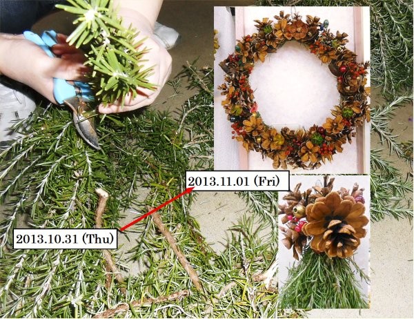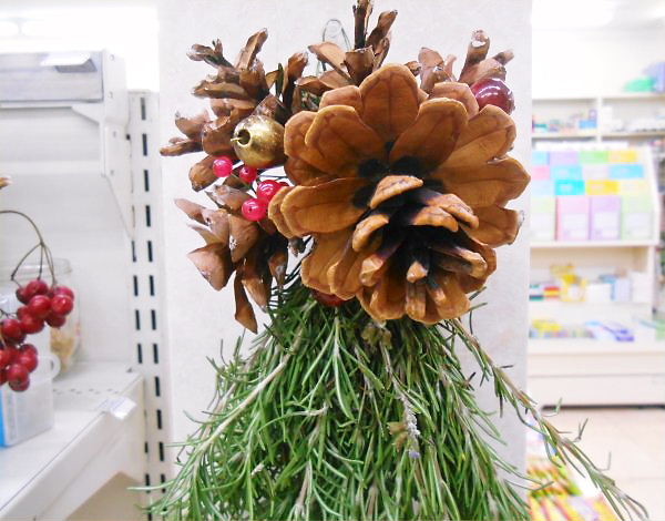 Y様から頂いたローズマリーと、エリーの散歩中に拾った「松と杉ぼっくり」で、Rが見事なリースや飾りを作りました。