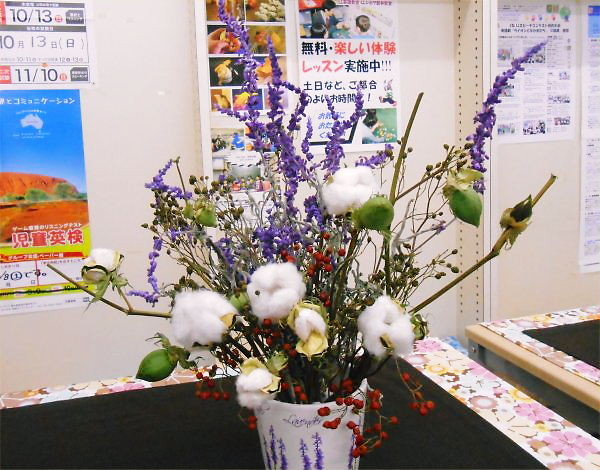 A big ornament in a vase was put on the table in Yorimichi-Café. It is coordinated with Mexican sage, cotton and rose-hips: red colored seeds of roses.
