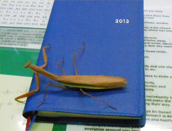 R again found the mantis which had been found twice. Yoshy took a picture of it on my pocketbook. It is 10 cm long. I have no idea it is male or female. I returned it to LL Garden.