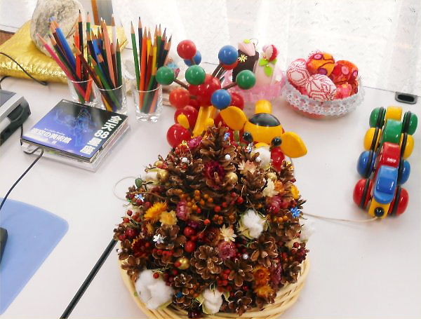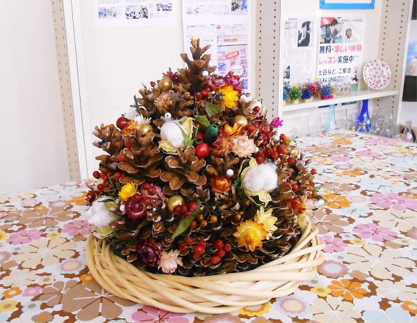 教室すぐそばで拾っておいた松と杉のぼっくり、RがLLの庭で育てた綿などで出来ています。