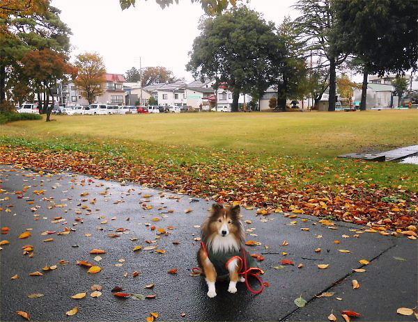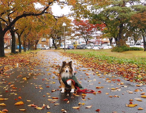 エリーは「晴れ女」で、この雨合羽で散歩はめったにありません。11月12日(火)朝の桜並木です。