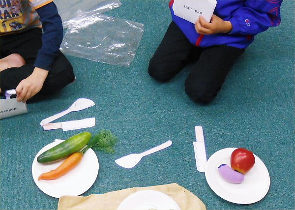 GA-students are going to make curry and rice this week, so we enjoyed learning the names of its ingredients and the expressions of cooking-actions through using “Immersion Method”.