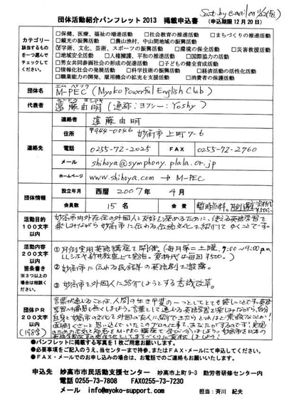 On Friday, November 22nd, an information form for “Pamphlet Introducing Activities of Volunteering Groups in 2013” arrived here, the office of Myoko Powerful English Club (M-PEC) from Myoko Community Support Center.