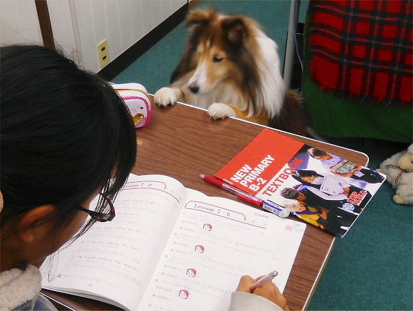 「書く直前に必ず声を出しましょう!」をどのクラスも守っています。エリーは自分が呼ばれたと思って、覗き込んでいます。