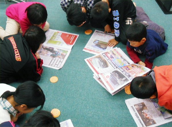 “To think upside down” … Ms. Y, one of the members of M-PEC presented me “Upside Down World Map” she bought during her trip to Australia. Now while looking at it, Yoshy can *flash lots of idea of teaching plans into my mind. Ms. Y, thank you very much for this map as well as newspapers.