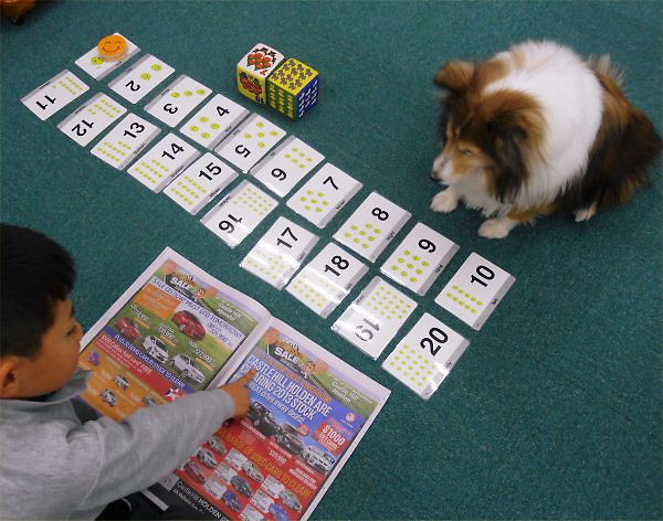 「足し算、引き算を英語で」、「英字新聞の中からヨッシーが発音したアルファベット探し」のゲーム中。…エリーはYくんと一緒に生徒の一人になりました。