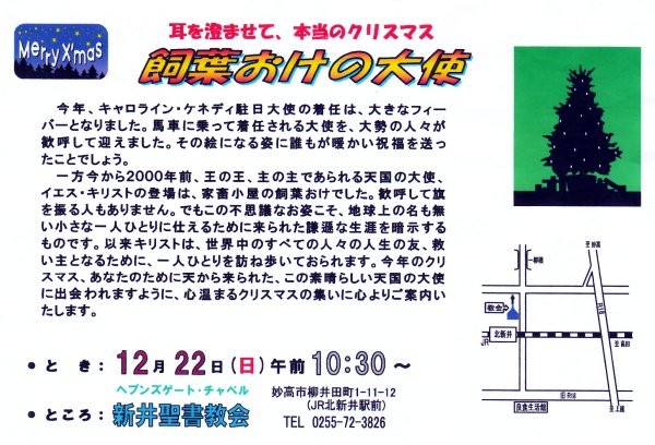 ・とき:12月22日(日)午前10:30~ ところ:新井聖書教会 TEL:0255-72-3826