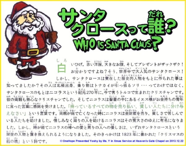 22日(日)の「新井聖書教会主催クリスマス礼拝」の折に、友人の Y様 (M-PEC会員) から頂いた「希望のストーリー」(OneHope:発行)にある「サンタさんは誰でしょう?」は、子供たちに分かりやすい日本語です。
