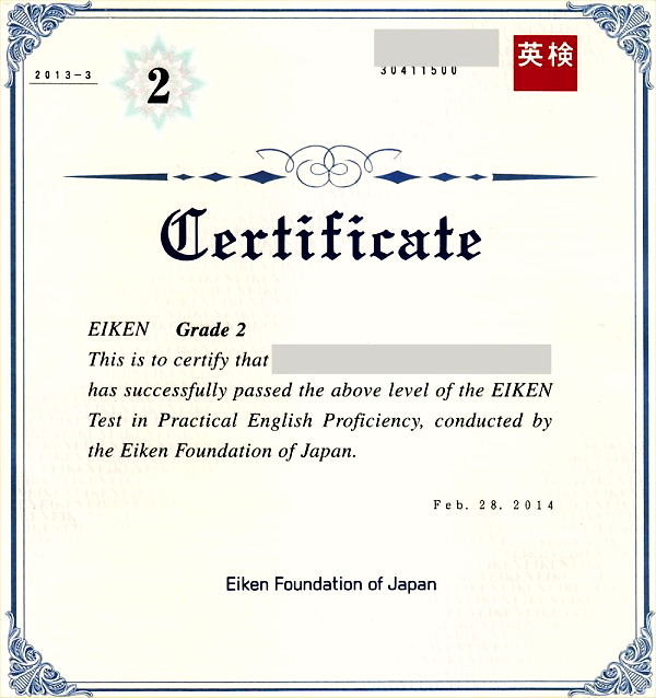 実用英検2級合格証書ご披露:Certificate of Eiken Grade 2nd