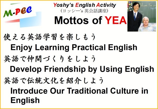 M-PEC「月例講座予告」(講座の1週間前までにブログや下記のサイトで)、活動過去記録等のご紹介は、You can see “Advance Billing of YEA : Yoshy’s English Activity, Record of “M-PEC” (Advance Billing is going to be written at both Blog and the site below.), etc: by clicking:HERE:ここをクリックなさってください。