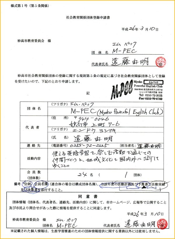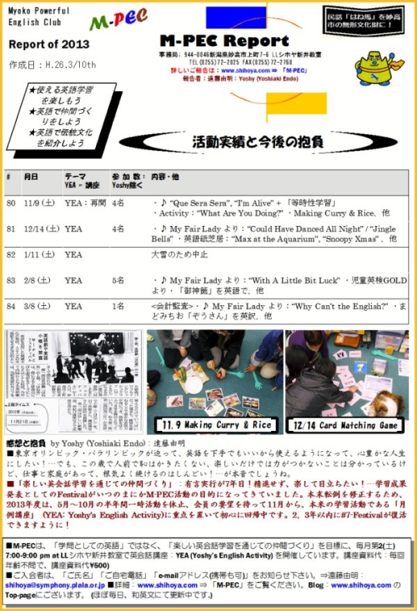On March 10th (Mon), Yoshy is going to Lifelong Learning Division in Myoko City Hall to explain “the report of M-PEC Activities in the year of 2013”.
