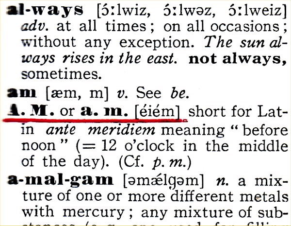 I showed this word, AM on “ISED, Idiomatic and Syntactic English Dictionary attributed to A. S. Hornby” to explain it. ISED is being used in the class of AA (Grade of Eiken 2nd) and above.