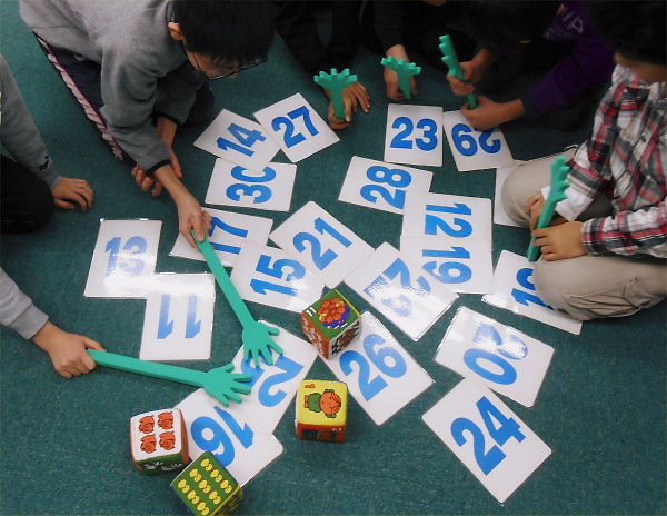 It was the day of Keichitsu. A boy, A, who is one of GA-class and 1st grader of elementary school is *chummy with Yoshy’s pet-dog, Erie very much. One of their activities was “the review of numbers to 30”. Rolling three kinds of *dice, e.g. they had to add *the numbers on the dice quickly like saying that three plus six plus five is fourteen, then swat the card written 14 on it!