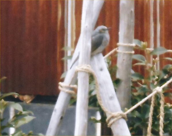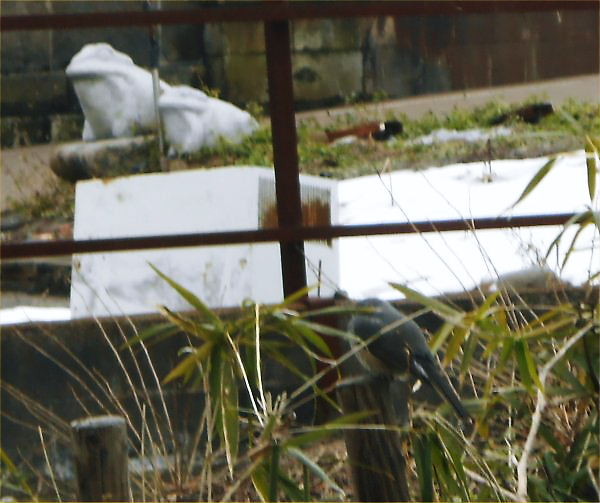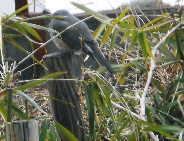 帰宅したら、Rが小声で「鵯(ヒヨドリ)がいるわよ」…まだ残雪が残るLLの庭の隅で餌を探していました。